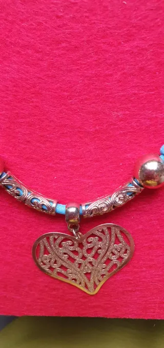 Elegante collar con piedras turquesas y un colgante de corazón. - Cadena de piedras turquesas irregulares. - Colgante grande en forma de corazón con filigranas. - Pequeño corazón turquesa en el centro del colgante.
