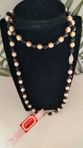 Elegante collar largo de Perlas de Mallorca, combinando perlas doradas y cuentas negras. Cierre de seguridad. - Perlas de Mallorca. - Combinación de colores negro y dorado. - Diseño largo.