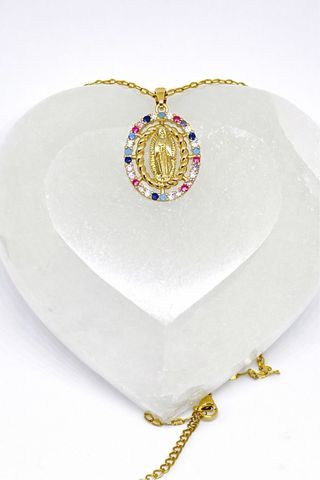 💖Collar Virgen de Guadalupe, en acero bañado en oro. ✨Diseño ovalado con la figura de la Virgen. 💫Borde circular con circonitas incrustadas. 📏Cadena dorada, acero, 40-45 cms 🚚 Envío rápido 💌 Se envía en bolsita guardapolvo.