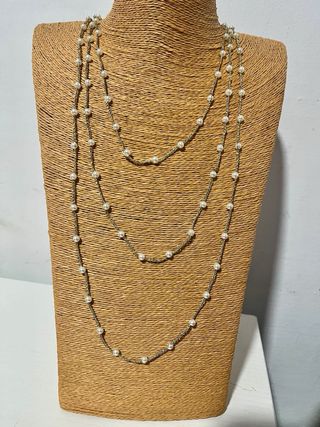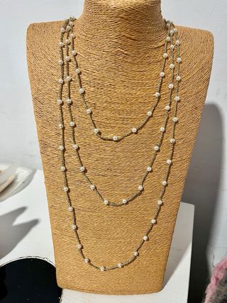 Elegante collar de varias vueltas con bolitas y cadena fina. - Diseño tejido a mano a crochet. - Combina bolitas blancas con detalles dorados.