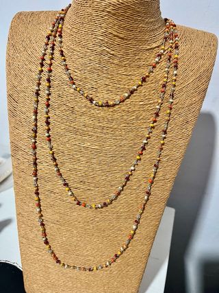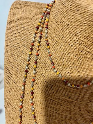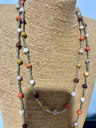 Collar largo tejido a mano con cuentas de colores. Se puede llevar de múltiples maneras. - Cuentas de diferentes tonos y materiales. - Diseño versátil para combinar con varios atuendos.