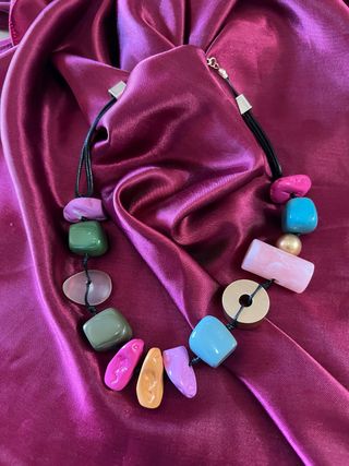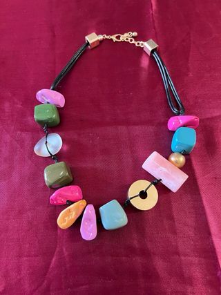 Collar llamativo con una variedad de abalorios de diferentes formas y colores. - Diseño con cuentas circulares y rectangulares. - Colores vibrantes que añaden un toque alegre. - Cierre de cordón ajustable.