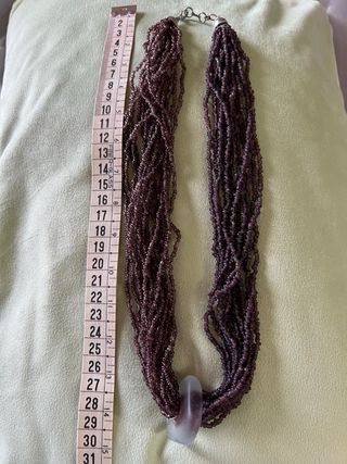 Elegante collar con múltiples hilos de cuentas finas en tono marrón . Presenta un detalle central de cristal translúcido con forma irregular. - Cierre de mosquetón. - Diseño de cascada con varias hebras.