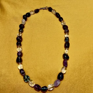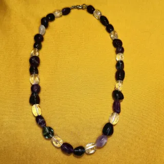 Elegante collar con cuentas de amatista y cristal de cuarzo verde y cristal de cuarzo trasparente - Diseño único y artesanal. - Combinación de tonos verdes, morados y transparentes. - Cierre metálico seguro.