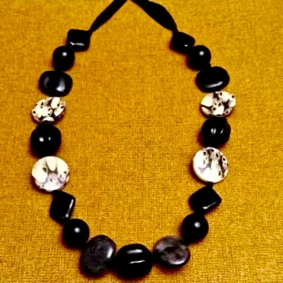 Collar con un diseño elegante en tonos negro y blanco. - Cierre de cinta. - Variedad de cuentas con diferentes formas y acabados.