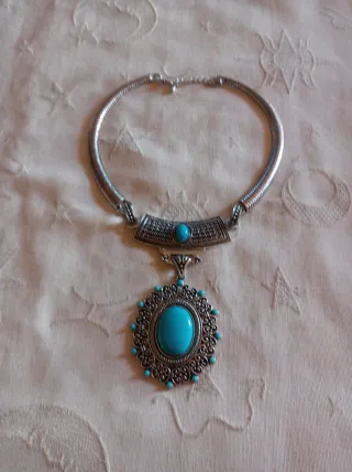 Bonito collar con un diseño llamativo y elegante. - Cadena tipo serpiente plateada. - Colgante central con piedra turquesa grande. - Detalles ornamentales en filigrana plateada. - Pequeñas piedras turquesas alrededor del colgante.