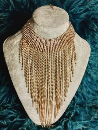 Elegante collar tipo gargantilla con un diseño llamativo de brillantes. - Cadena dorada con múltiples hilos de pedrería. - Cierre ajustable para mayor comodidad. - Estilo cascada con caída de brillantes.