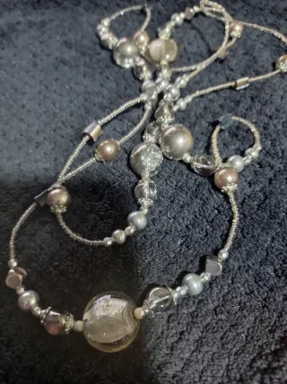 Elegante collar largo y llamativo de una y dos vueltas con una combinación de perlas eléctricas grises y metalizados azules cambiantes a la luz, bolas más grandes de cristal transparente con fondo lluvia plateado y marrones con inclusión en el interior. Su diseño versátil lo hace perfecto para complementar diversos atuendos. Mide 60 cm largo vuelta entera 120 cm no es mate, la foto salió un poco sin luz, los brillos son metálicos y transparentes viendo su interior