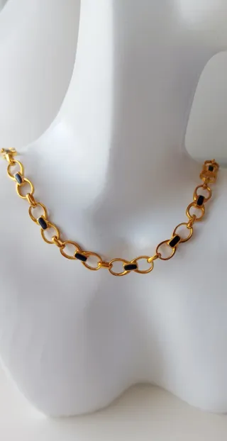 Elegante conjunto de collar y pulsera con chapado en oro. El diseño presenta eslabones circulares intercalados con detalles en negro. - Se vende por separado: Collar 10€- Pulsera 8€ - Eslabones circulares. - Detalles en color negro.