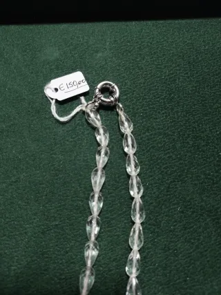 Elegante collar de bisutería con un diseño que evoca la moda antigua. - Cuentas de cristal transparentes facetadas. - Pequeñas perlas plateadas intercaladas. - Estilo vintage, inspirado en la década de 1930.