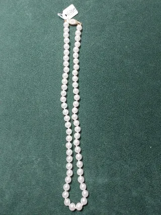 Elegante collar con cuentas de cuarzo blanco. - 34 cuentas de cuarzo blanco. - Cierre chapado. - 47cm. - Alguna piedra rota. Venta por cierre de joyería.