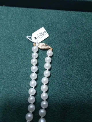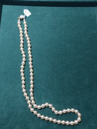Elegante collar de perlas con un cierre dorado. - Perlas de color blanco brillante de 7mm. - Cierre chapado en oro. - 52cm. Venta por cierre de joyería. 00371
