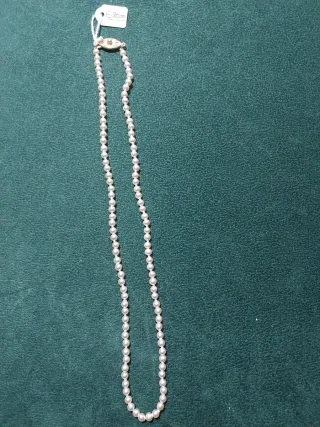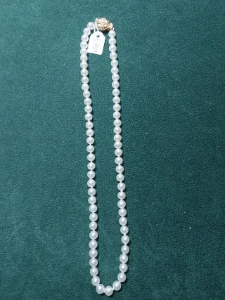 Elegante collar de perlas blancas con broche dorado. - Perlas blancas de 7mm. - Cierre chapado en oro. - 48.5cm. Venta por cierre de joyería. 00380