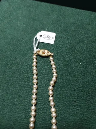 Elegante collar de perlas pequeñas blanco brillante y cierre dorado con perla central. - Cierre chapado en oro. - Perlas blancas nacaradas de 3mm. - 46.5cm. Venta por cierre de joyería. 00383