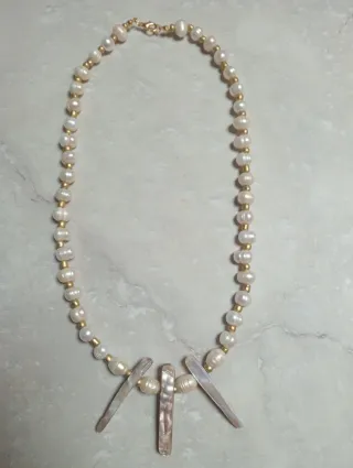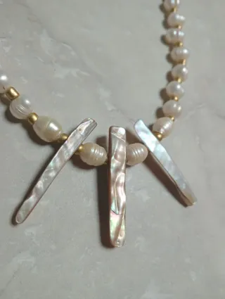 Elegante collar con perlas semi-barrocas y detalles de abulón. - Perlas semi-barrocas. - Elementos centrales de abulón con reflejos iridiscentes. - Cuentas doradas de cristal intercaladas. - Cierre metálico de mosquetón.