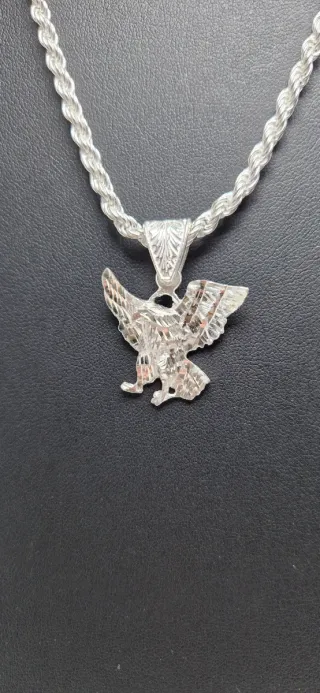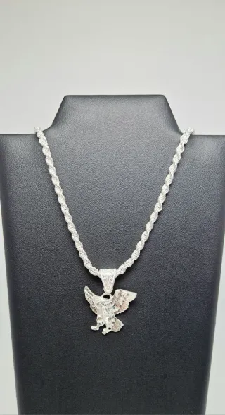 Este conjunto incluye un collar de cordón y un colgante con diseño de águila. - Collar estilo cordón macizo de 60cms y 3,5mm de grueso. Ref 02232 - Colgante con forma de águila detallada. Mide 26x26mm sin contar el asa.Ref 02886 Las dos piezas son de plata de ley de 925mm. Nada de baños.