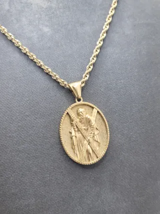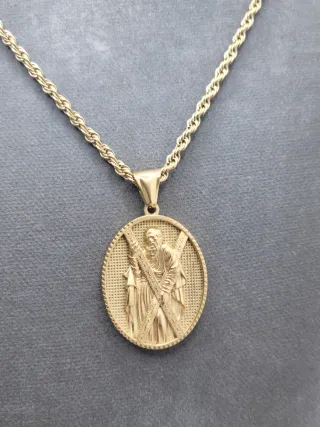 Collar con colgante de San Andrés y cruz. - Colgante ovalado con figura. - Acero quirúrgico chapado en oro
