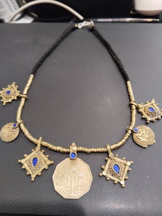 Collar con un colgante de moneda de Irak con diseño de palmeras datileras y detalles en azul. - Colgante con forma octogonal. - Representación de palmeras datileras. - Elementos decorativos en color azul.