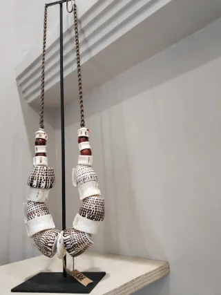 Collar artesanal con conchas marinas y cuentas de madera. - Diseño único con conchas naturales. - Combina tonos marrones y blancos.