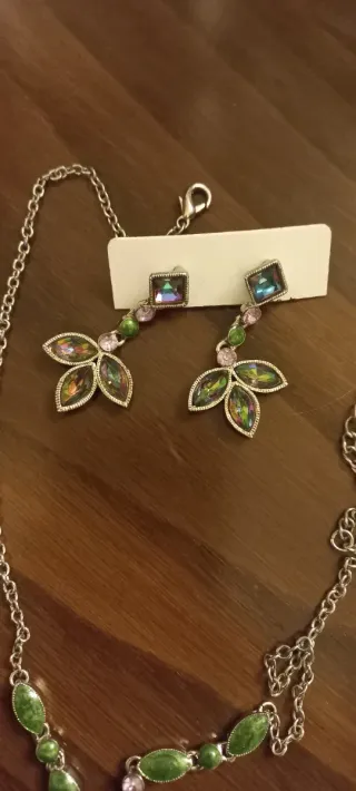 Precioso conjunto de collar y pendientes con un diseño inspirado en hojas. Los detalles en tonos verdes y morados le dan un toque elegante. - Collar con colgante central y cadena. - Pendientes a juego con cierre.