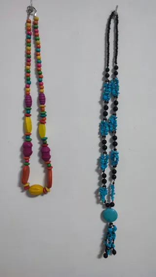 Conjunto de dos collares, uno de madera multicolor y otro con detalles en turquesa. - Collar de madera con cuentas de colores variados y formas. - Collar largo con cuentas negras y colgantes de turquesa. - Detalle de un gran colgante circular en turquesa en el collar largo.
