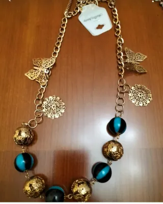 Elegante collar con un diseño único y llamativo. - Cadena dorada con eslabones. - Colgantes de mariposas caladas. - Cuentas esféricas doradas con relieve. - Cuentas redondas en azul y negro.