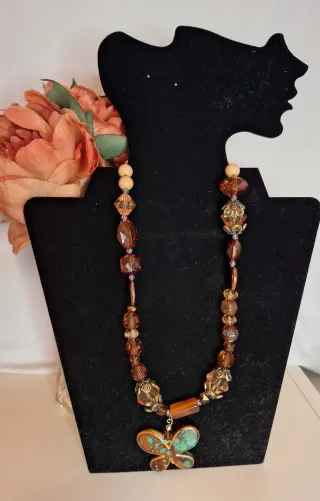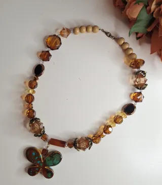 Collar con colgante de mariposa y cuentas. - Colgante con diseño de mariposa. - Cuentas en tonos marrones y transparentes. - Cierre de mosquetón.