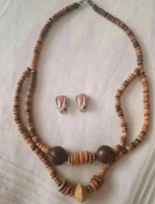 Conjunto de collar y pendientes a juego, elaborados con materiales naturales. - Collar de dos vueltas con cuentas de madera. - Detalle de cuentas de madera más grandes y un colgante central. - Pendientes a juego con cuentas de madera.