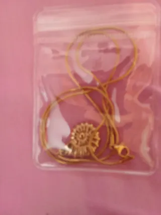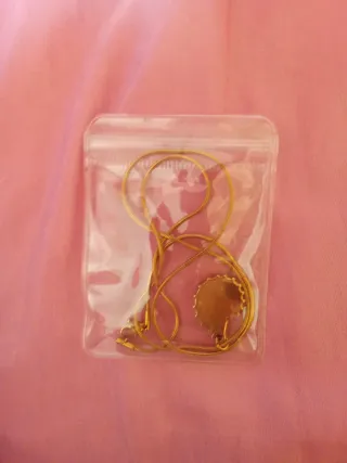 Conjunto de collar y pendientes dorados. Comprado en una tienda de segunda mano por 15,99€. Está en buen estado, se vende porque no se utiliza. Los pendientes vienen con cierre y tope. No produce alergias. Es de acero inoxidable.
