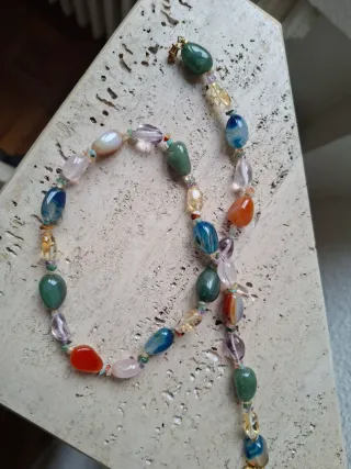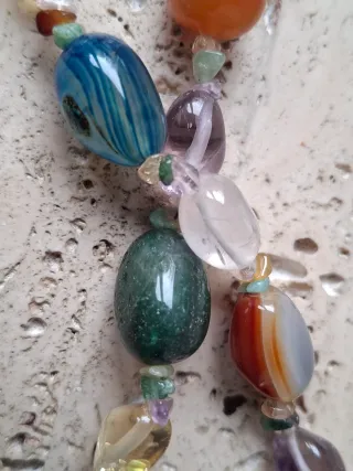Elegante collar con piedras brasileñas de diversos colores y formas. - Cierre dorado con rosca - Diseño único y llamativo. Longitud: 60 cm