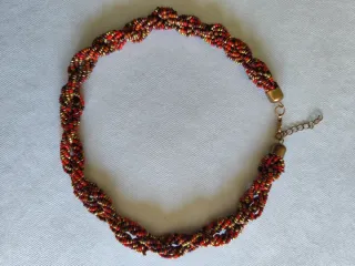 Elegante collar de cuentas con un diseño trenzado. - Elaborado con cuentas en tonos dorados y rojos. - Cierre de mosquetón con cadena de ajuste.