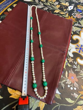 Elegante collar largo con perlas cultivadas y cuentas de esmeralda rústica.NO IMITACION - Perlas de color blanco nacarado. - Cuentas de esmeralda de un vibrante color verde. - Diseño único y artesanal.