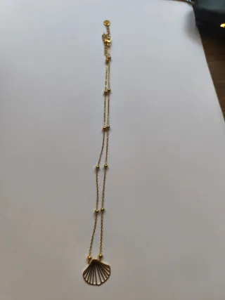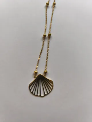 Elegante collar con un colgante en forma de concha marina. La cadena está adornada con pequeñas bolitas doradas. - Diseño de concha estilizada. - Cadena fina con detalles. - Acabado brillante. Acreditado con el sello de Artesanía Galicia. ⚠️Nunca usado, está en el envoltorio original