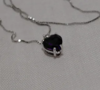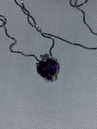 Collar y Colgante oro blanco 18k con diamante de 0.01ct de corte brillante, grado color G/H, grado claridad vs1/vs2 y grado de corte excelente. La piedra secundaria es amatista en forma de corazon con peso de 0.30ct. Peso 1.1gm. Incluye cadena veneciana en oro blanco de 18k ajustable de 40-45cm. Nuevo a estrenar. Joya creada a mano en Italia. Garantia gemológica.