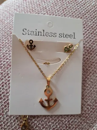 Elegante conjunto de collar y pendientes con diseño de ancla. - Material: Acero inoxidable. - Acabado: Dorado.