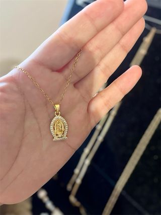 Elegante collar con colgante de la Virgen de Guadalupe. - Baño de oro. - Diseño detallado con circonitas.