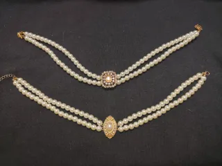 Precio por unidad Elegante collar de fallera con dos hileras de perlas y un detalle central. - Perlas de color blanco nacarado. - Adorno central con detalles dorados y una piedra central. - Diseño clásico y refinado.