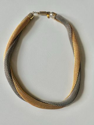 Elegante collar de Orena París con un diseño trenzado que combina tonos dorados y plateados. Cierre de seguridad. - Diseño de malla entrelazada. - Combinación de colores oro y plata.