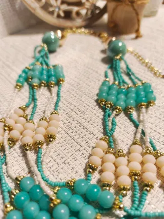 Elegante collar artesanal con cuentas de varios tamaños y colores. - Diseño con múltiples hilos. - Cuentas de tonos beige y verde turquesa. - Detalle de cuentas doradas entre las principales. Cualquier duda preguntame. Artículo sin devolución. Colonia, perfume, sombras, vintage, decoración, bolso, collar, abalorios, extensiones, mallas, rodetes, fallera,Valenciana, gafas, pendientes, accesorios, muñecas ,ropa, cinturón, gorra.