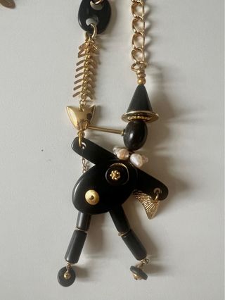 Collar largo con un diseño llamativo y elegante. - Pieza central con forma de figura articulada. - Detalles en forma de espina de pez y flecha. - Cuentas de madera y perlas. - Cadena dorada.