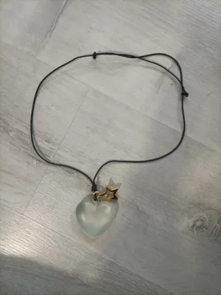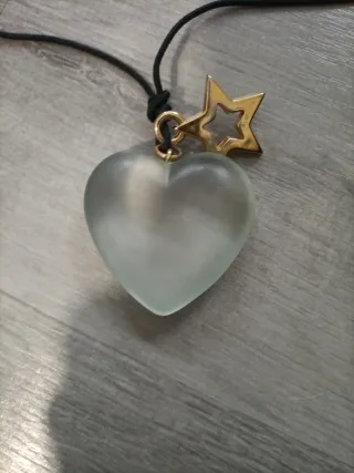Collar con un colgante en forma de corazón transparente y una pequeña estrella dorada. - Colgante de corazón translúcido. - Detalle de estrella dorada. - Cordón negro ajustable.