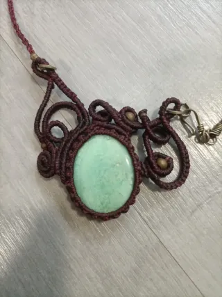 Collar hecho a mano con un bonito diseño y una piedra central. - Cuerda de macramé en tono marrón. - Piedra ovalada de color verde.