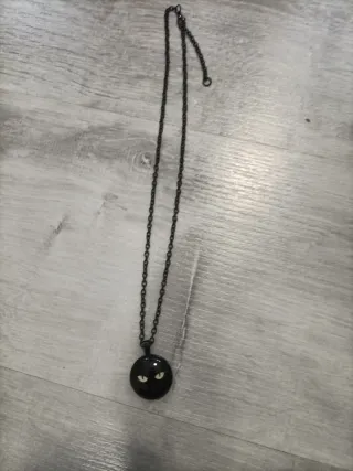 Collar con un diseño inspirado en un gato. - Colgante redondo negro. - Detalle de ojos amarillos brillantes.