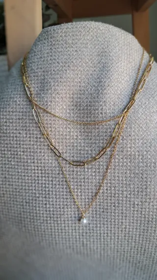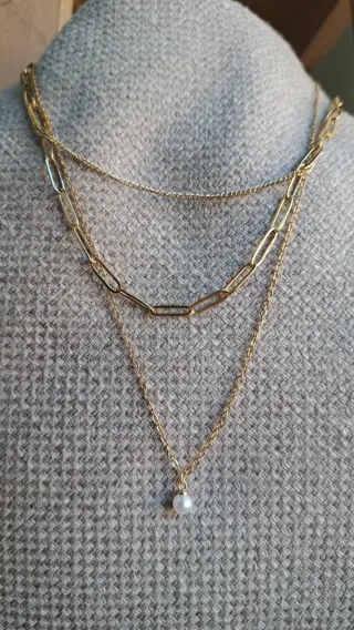Elegante collar de multicapas con un detalle de perla. 🎁REGALO PULSERA A JUEGO - Diseño de tres cadenas superpuestas. - Cadena principal con eslabones tipo paperclip. - Cadena fina con acabado texturizado. - Colgante de perla individual.