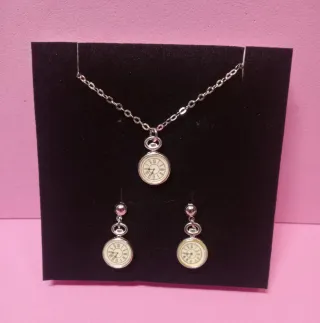 Este conjunto incluye un collar y un par de pendientes con un diseño de reloj. - Diseño de reloj con esfera. - Cadena de Acero. - Cierre de mosquetón.