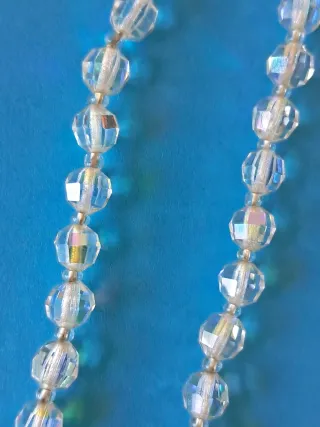 Brillante gargantilla/collar vintage de los años 60, en cristal faceteado iridiscente. Largo 47cm. Cierre antiguo pero en perfecto estado de uso.
