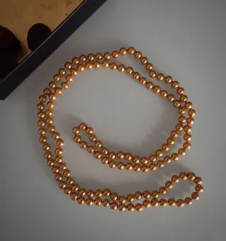 Collar dorado de perlas de bisuteria. Mide 120 cm. y pesa 88 gramos.
