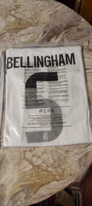 Camiseta de fútbol del Real Madrid con el nombre y número de Bellingham. - Tallas M L XL - Nombre: BELLINGHAM - Número: 5 - Escudo del Real Madrid visible.