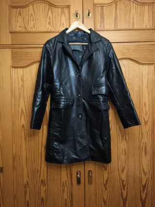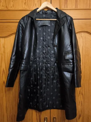 Abrigo largo de piel sintética. - Cierre de botones. - Dos bolsillos frontales con solapa. - Cuello de solapa clásico.