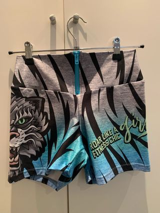 Pantalón corto de entrenamiento con un diseño llamativo. - Estampado de tigre y rayas. - Degradado de azul a gris. - Cremallera frontal. - Inscripción ROAR LIKE A FITNESS CHIC y girl.